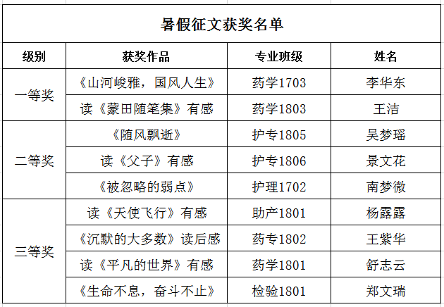为倡导读书风尚,营造良好的读书氛围,繁荣校园课余文化生活,促进杏林学子成长,学生养成阅读习惯,培养学生“爱读书、会读书、读好书”的能力,我院举办了暑期“读经典好书 品百味人生”杏林书香读书征文活动。