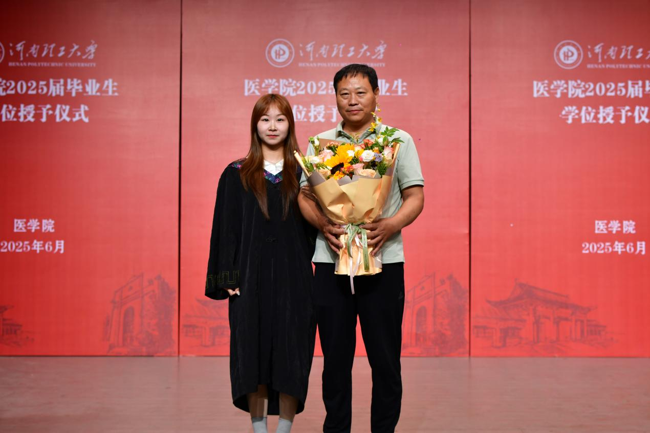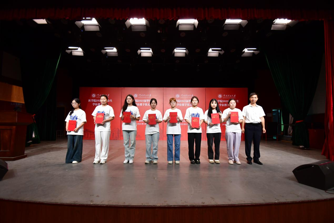 仪式中,张向锋为获得河南省2025年优秀应届毕业生的学生颁奖,王振辉为2025年医学院毕业生益禾奖学金获得者颁奖,表彰他们德智体美劳全面发展的卓越表现。最后,学院领导为毕业生授学士学位,身着学士服的庄重是对学业圆满的印证,学士帽流苏的流转更蕴含着母校对学子未来发展的深切期许。
