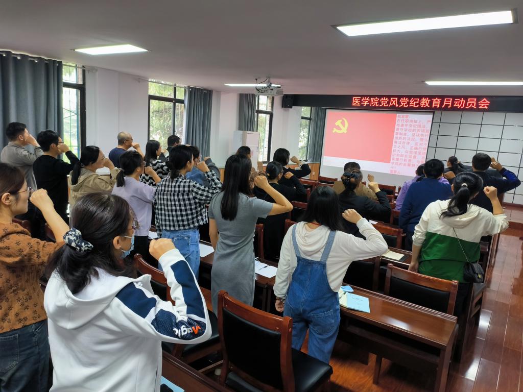 随后,医学院组织全体党员干部进行了廉政示范宣誓活动。大家表示坚决拥护以习近平同志为核心的党中央,坚决拥护党中央关于全面从严治党的决策部署,坚决拥护党纪国法,永葆共产党人政治本色的鲜明立场和坚定决心。党员代表还进行了发言,表示一定严格遵守党纪国法,坚决同一切违纪违法行为作斗争,保持清正廉洁的政治品质。